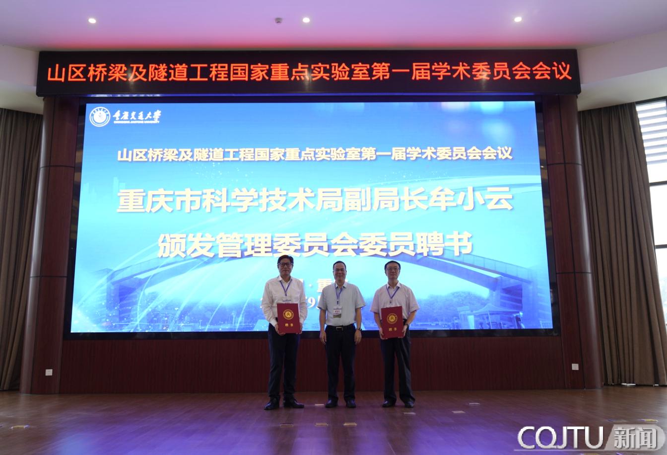 重庆市科技局副局长牟小云为管理委员会主任委员、重庆交通大学校长唐伯明,副主任委员、重庆交通大学理事会理事长钟华颁发山区桥梁及隧道国家重点实验室第一届管理委员会成员聘书。