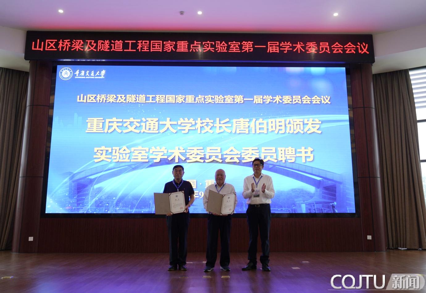 重庆交通大学校长、管理委员会主任委员唐伯明为学术委员会主任委员、副主任委员郑皆连院士、杜彦良院士颁发实验室第一届学术委员会委员聘书。