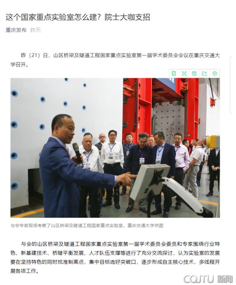 据了解,今年6月份,重庆交通大学山区桥梁及隧道工程国家重点实验室揭牌,这也意味着重庆交大在科技创新中实现了历史性突破,在学科专业建设上迈上了国家级新平台,在创新驱动发展上迈入了跨越式新征程。