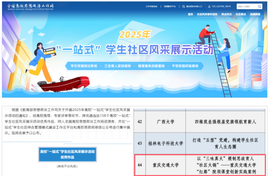 延伸阅读:学校自2022年获批重庆市首批“一站式”学生社区建设自主试点高校以来,始终以立德树人根本任务为核心,探索构建“1256N”社区生态育人模式,将党建引领贯穿全过程,传承弘扬红岩精神与“两路”精神,下沉党政力量、思政力量、专业力量、管理力量和服务力量等五支队伍,聚焦党团建设、队伍入驻、学生参与、文化建设、数字赋能和条件保障六大维度,建成科学城校区德园“两路”先锋“一站式”综合服务大厅、南岸校区菁园综合服务大厅、“古井·2011”文化庭院、礼园宿舍门厅文化空间等社区综合育人空间,培育39项社区育人项目,打造N类特色育人名片,构建起全方位、多层次、立体化社区育人新生态。今年9月,学校《重庆交通大学以“三味真火”煨制思政育人“社区火锅”,打造“红路”院坝课堂》和《重庆交通大学创设“AI +创新实践基地”,赋能社区育人新场域》2项典型案例入选2025年全国高校“一站式”学生社区风采展示活动优秀作品名单。此外,创新开展2025级新生“双积计划”骨干训练营开班,以“积跬步以至千里,积小流以成江海”的理念为新生骨干筑牢思想根基、锤炼过硬本领铺设坚实阶梯。学校学生工作系统将以系列成绩为契机,总结推广典型经验,持续优化项目培育机制,深化“1256N”综合管理模式创新,推动“一站式”学生社区建设向更深层次、更高质量发展。