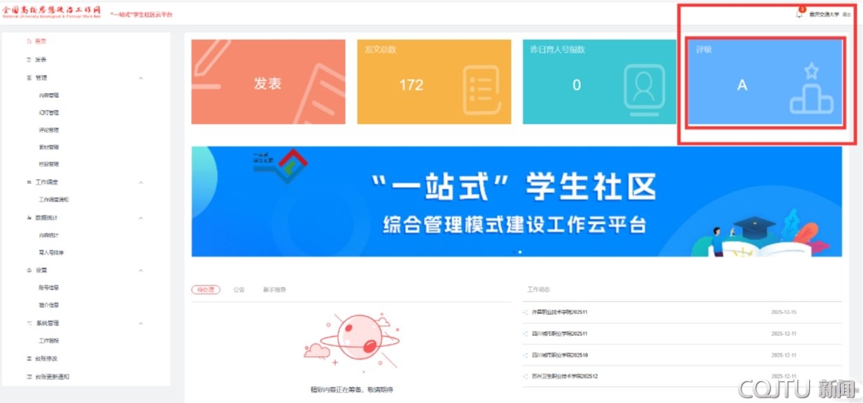 摘要:2025年12月,教育部全国思想政治工作网公布2025年高校“一站式”学生社区综合管理模式评级结果,重庆交通大学凭借扎实的建设成效、丰硕的实践成果,实现从C级到B级又晋升为A级的跨越,跻身全国普通高等院校前15%行列。