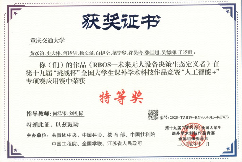 摘要:2025年11月,由共青团中央、中国科学技术协会、教育部、中国社会科学院、中国工程院、中华全国学生联合会、江苏省人民政府主办的第十九届“挑战杯”全国大学生课外学术科技作品竞赛决赛在南京大学落幕。重庆交通大学2支学生团队喜获特等奖1项、二等奖1项,系“人工智能+”专项赛唯一获得特等奖的重庆本科高校,也是1989年第一届“挑战杯”竞赛举办以来首次获全国特等奖。